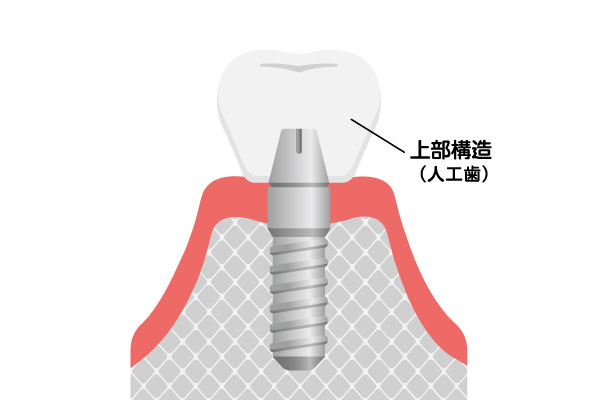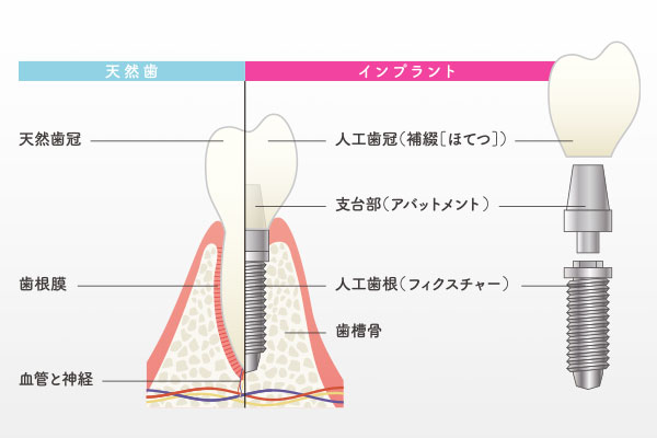 インプラント治療とは、むし歯や歯周病、外傷などで失ってしまった歯の代わりに、人工の歯根(インプラント体)をあごの骨に埋め込み、その上に人工の歯を装着して機能と見た目を回復させる治療です。インプラント体には、生体との親和性が非常に高いチタンが使われており、チタンが骨と強固に結合する性質を利用して、ご自身の歯のように安定し、しっかりと噛むことができます。