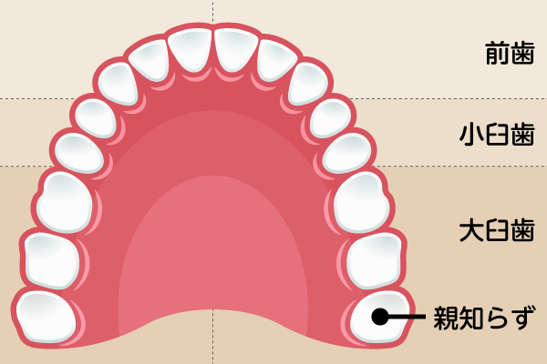 親知らず(智歯)は、前歯から数えて8番目、最も奥に生えてくる永久歯です。生えてくる時期が10代後半から20代前半と遅いため、すでに他の歯が生え揃っており、現代人のあごの骨ではスペースが不足していることが多くあります。そのため、親知らずが傾いて生えたり、歯ぐきの中に埋まったままになったりすることで、痛みや腫れ、手前の歯のむし歯や歯周病の原因となることがあります。